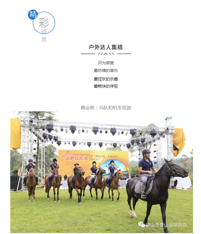 协办单位:中山市原创音乐协会、 五桂山摄影协会、 中山市攀岩运动协会、中山市摩托车运动协会、中山市火炬开发区无线电应急通讯志愿服务队、恒动力健身俱乐部、挑战者户外、云途户外、零点户外、点滴户外、酷途户外、香山浪趣旅行、优中山、岐江之友独木舟俱乐部、中山大智无疆科技有限公司、中山草地音乐会、百越旭峰体育有限公司、长安马自达中山市万事得汽车销售服务有限公司、古香林户外